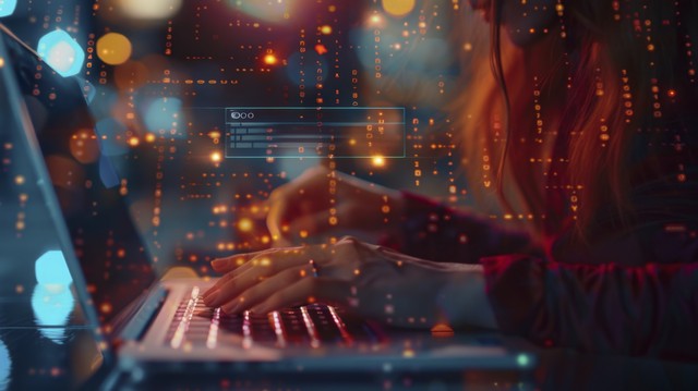 网络安全概念。 在笔记本电脑上使用应用程序的女性特写
