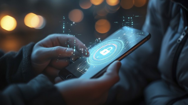 网络安全概念 男子在虚拟屏幕上使用智能手机和锁定图标