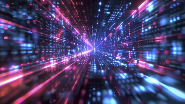 数字技术。 高速数据传输。 3D 插图中的信息流。 未来霓虹灯网络空间中的运动