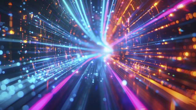 数字技术。 高速数据传输。 3D 插图中的信息流。 未来霓虹灯网络空间中的运动