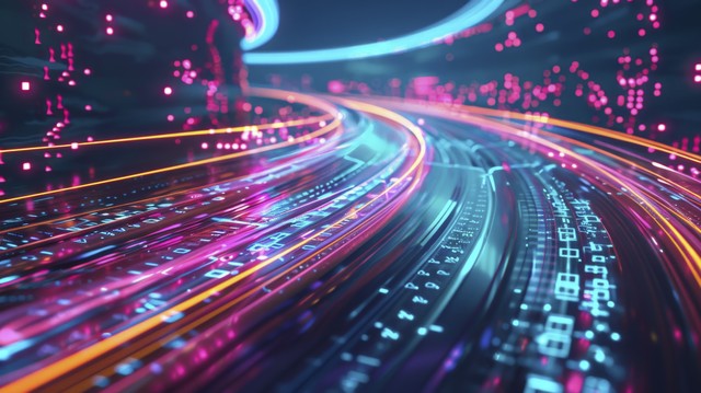 数字技术。 高速数据传输。 3D 插图中的信息流。 未来霓虹灯网络空间中的运动