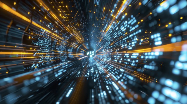 数字技术。 高速数据传输。 3D 插图中的信息流。 未来霓虹灯网络空间中的运动