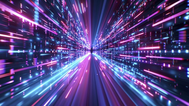 数字技术。 高速数据传输。 3D 插图中的信息流。 未来霓虹灯网络空间中的运动