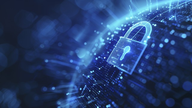 安全概念数字网络安全上的闭合挂锁蓝色抽象高速互联网技术背景插图。 钥匙。
