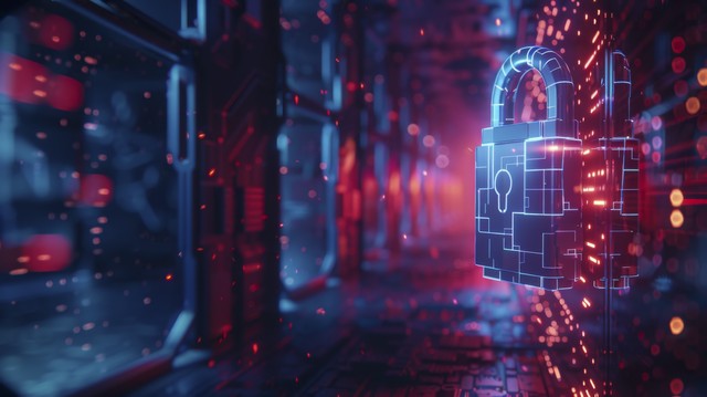 安全概念数字网络安全上的闭合挂锁蓝色抽象高速互联网技术背景插图。 钥匙。