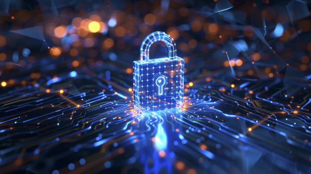 安全概念数字网络安全上的闭合挂锁蓝色抽象高速互联网技术背景插图。 钥匙。