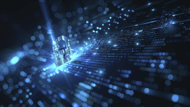 安全概念数字网络安全上的闭合挂锁蓝色抽象高速互联网技术背景插图。 钥匙。
