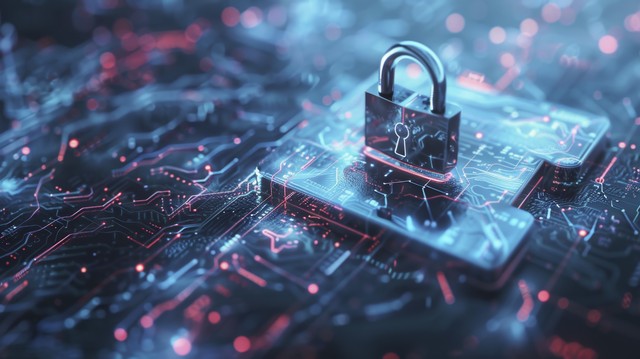 安全概念数字网络安全上的闭合挂锁蓝色抽象高速互联网技术背景插图。 钥匙。