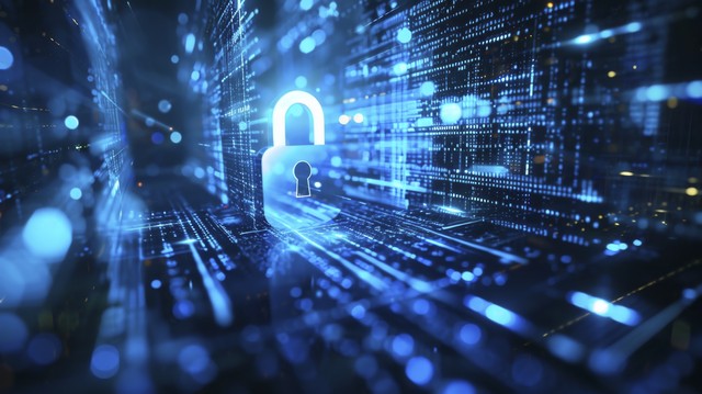 安全概念数字网络安全上的闭合挂锁蓝色抽象高速互联网技术背景插图。 钥匙。