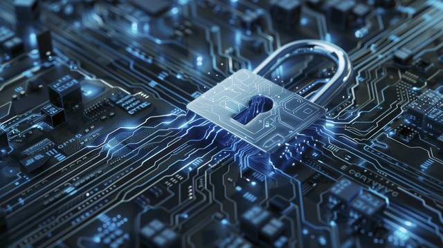安全概念数字网络安全上的闭合挂锁蓝色抽象高速互联网技术背景插图。 钥匙。