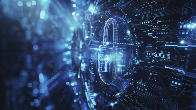 安全概念数字网络安全上的闭合挂锁蓝色抽象高速互联网技术背景插图。 钥匙。