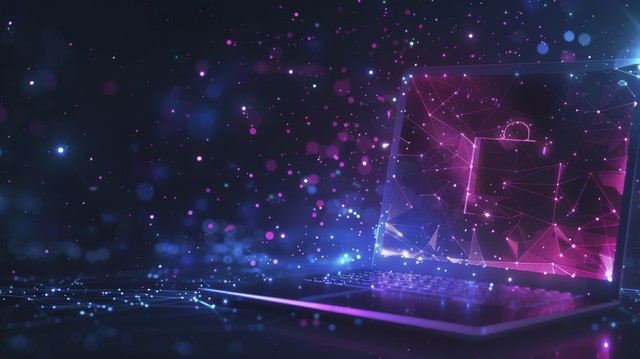 锁定笔记本电脑屏幕。 低聚线框矢量图。 数字数据保护或安全概念。 星空由深色背景上的点线和形状组成。