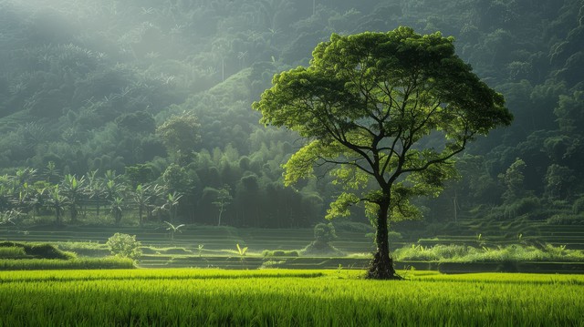 一个宁静的自然场景。中心位置有一棵枝繁叶茂的大树