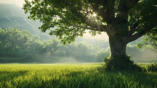一个宁静的自然场景。中心位置有一棵枝繁叶茂的大树