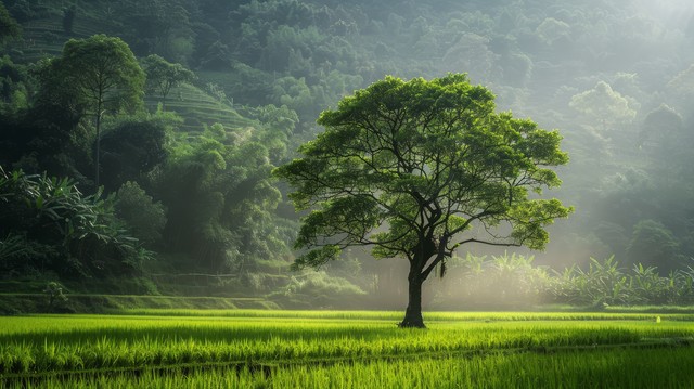 一个宁静的自然场景。中心位置有一棵枝繁叶茂的大树