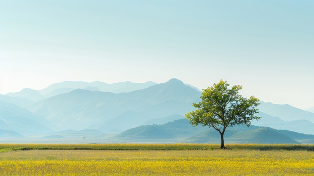 一个宁静的自然场景。中心位置有一棵枝繁叶茂的大树