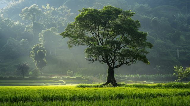 一个宁静的自然场景。中心位置有一棵枝繁叶茂的大树