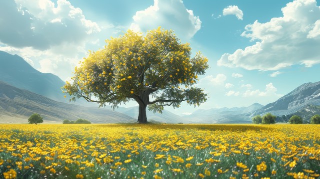 一个宁静的自然场景。中心位置有一棵枝繁叶茂的大树