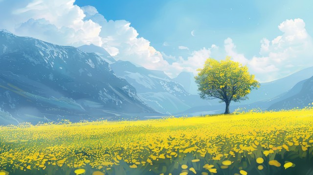 一个宁静的自然场景。中心位置有一棵枝繁叶茂的大树