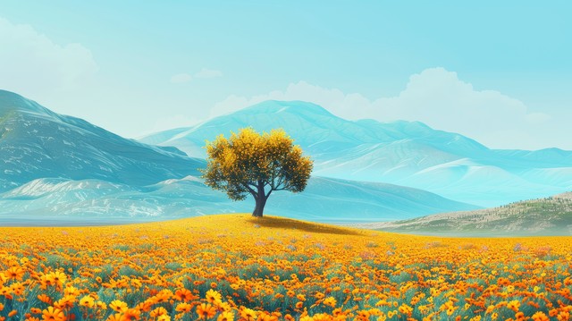 一个宁静的自然场景。中心位置有一棵枝繁叶茂的大树