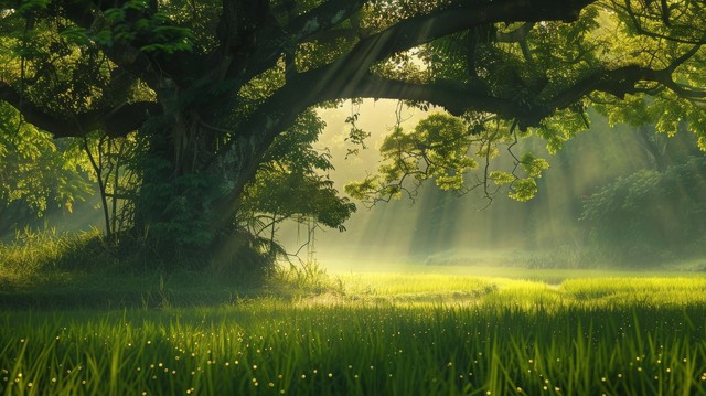 一个宁静的自然场景。中心位置有一棵枝繁叶茂的大树