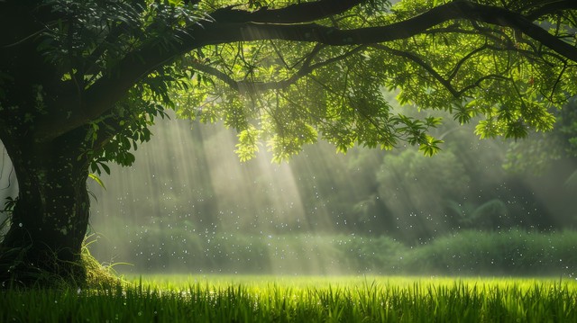 一个宁静的自然场景。中心位置有一棵枝繁叶茂的大树