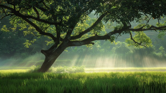 一个宁静的自然场景。中心位置有一棵枝繁叶茂的大树