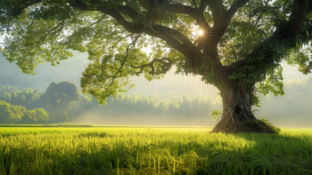 一个宁静的自然场景。中心位置有一棵枝繁叶茂的大树