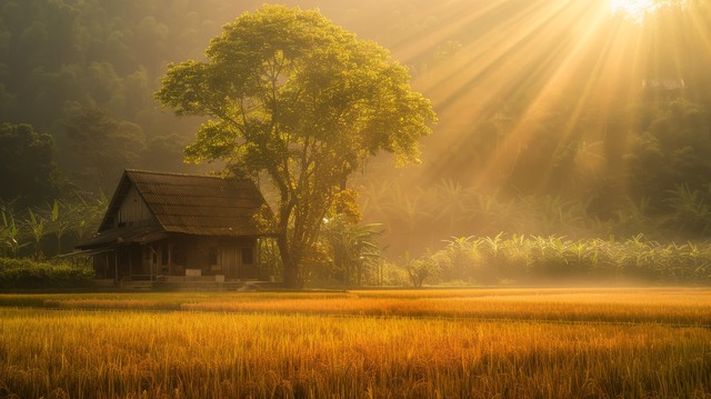 一个宁静的自然场景。中心位置有一棵枝繁叶茂的大树