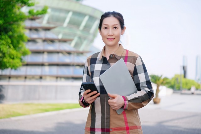 户外配备笔记本电脑和智能手机的年轻专业人士