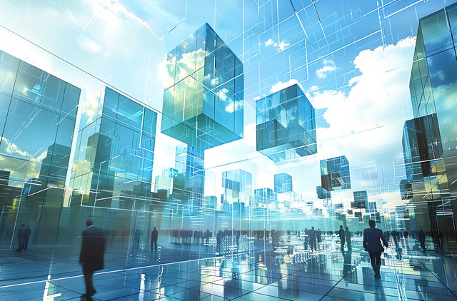 未来城市中的全息数字建筑与商务人员,融合AI技术。
