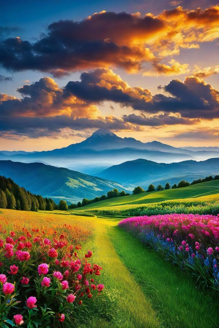 美丽风景,青山连绵,绿地无垠,花朵缤纷绽放,令人心醉的自然之景,大自然的杰作背景,神秘旅游游玩胜地