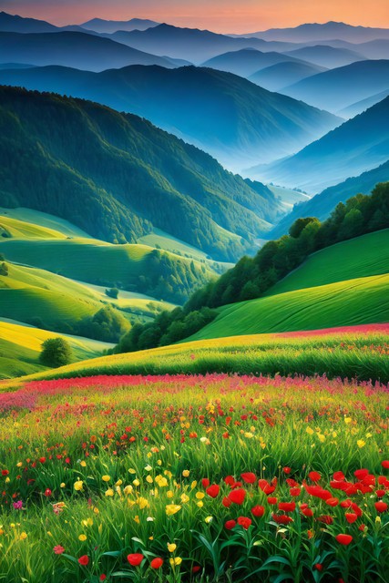 美丽风景,青山连绵,绿地无垠,花朵缤纷绽放,令人心醉的自然之景,大自然的杰作背景,神秘旅游游玩胜地