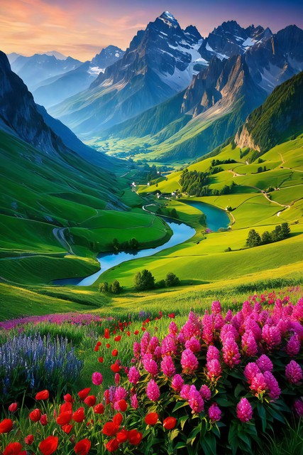 美丽风景,青山连绵,绿地无垠,花朵缤纷绽放,令人心醉的自然之景,大自然的杰作背景,神秘旅游游玩胜地
