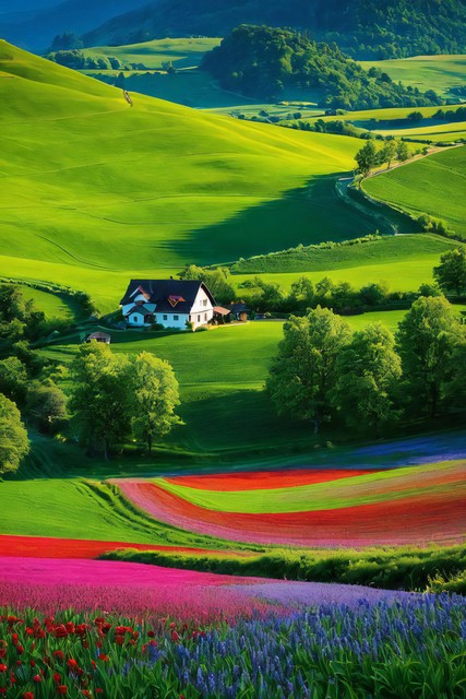 美丽风景,青山连绵,绿地无垠,花朵缤纷绽放,令人心醉的自然之景,大自然的杰作背景,神秘旅游游玩胜地