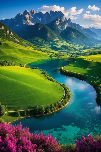 美丽风景,青山连绵,绿地无垠,花朵缤纷绽放,令人心醉的自然之景,大自然的杰作背景,神秘旅游游玩胜地