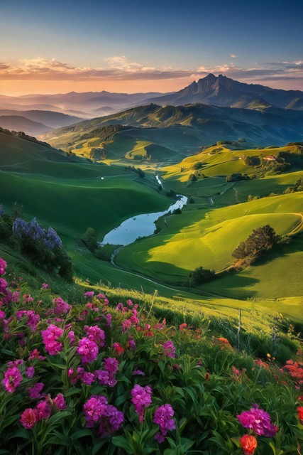 美丽风景,青山连绵,绿地无垠,花朵缤纷绽放,令人心醉的自然之景,大自然的杰作背景,神秘旅游游玩胜地