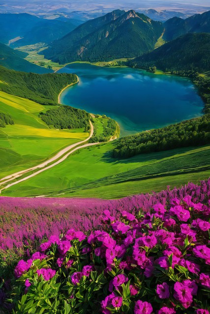 美丽风景,青山连绵,绿地无垠,花朵缤纷绽放,令人心醉的自然之景,大自然的杰作背景,神秘旅游游玩胜地