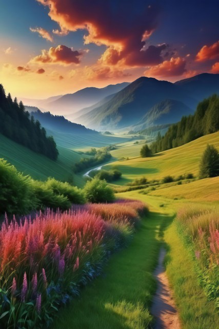 美丽风景,青山连绵,绿地无垠,花朵缤纷绽放,令人心醉的自然之景,大自然的杰作背景,神秘旅游游玩胜地