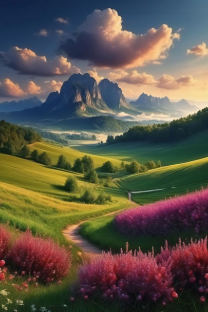美丽风景,青山连绵,绿地无垠,花朵缤纷绽放,令人心醉的自然之景,大自然的杰作背景,神秘旅游游玩胜地