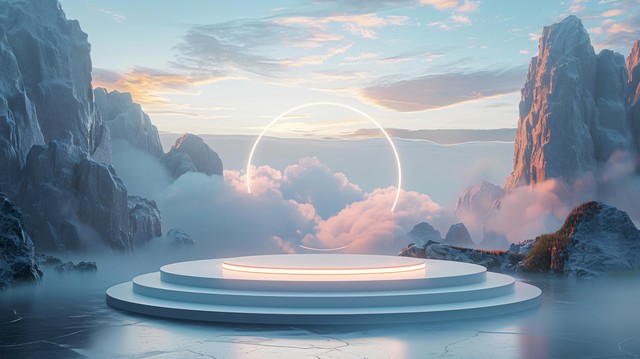 "和谐共融:自然风光前的产品展台,展示与自然和谐共生的现代设计理念"