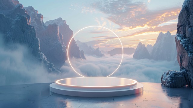 "和谐共融:自然风光前的产品展台,展示与自然和谐共生的现代设计理念"