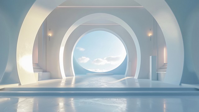 "和谐共融:自然风光前的产品展台,展示与自然和谐共生的现代设计理念"