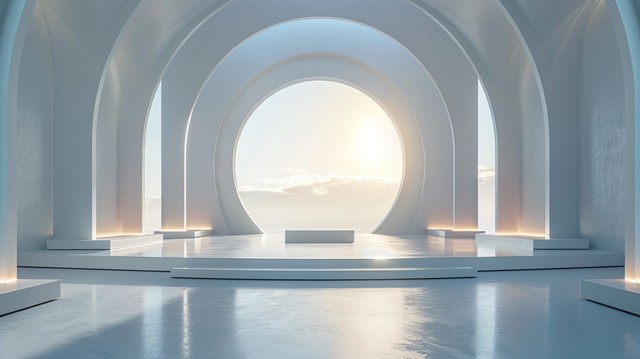 "和谐共融:自然风光前的产品展台,展示与自然和谐共生的现代设计理念"