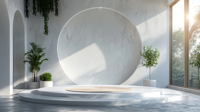 "和谐共融:自然风光前的产品展台,展示与自然和谐共生的现代设计理念"