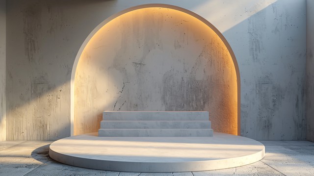 "和谐共融:自然风光前的产品展台,展示与自然和谐共生的现代设计理念"