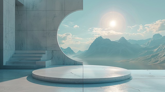 "和谐共融:自然风光前的产品展台,展示与自然和谐共生的现代设计理念"