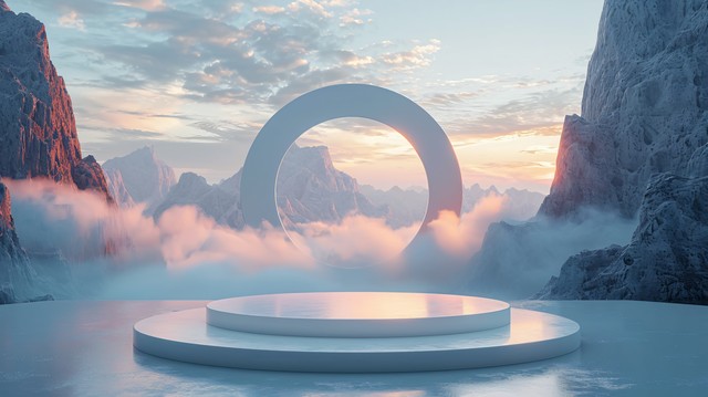 "和谐共融:自然风光前的产品展台,展示与自然和谐共生的现代设计理念"