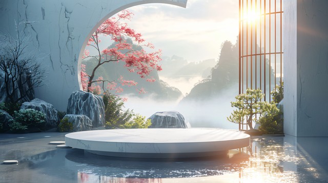 "和谐共融:自然风光前的产品展台,展示与自然和谐共生的现代设计理念"