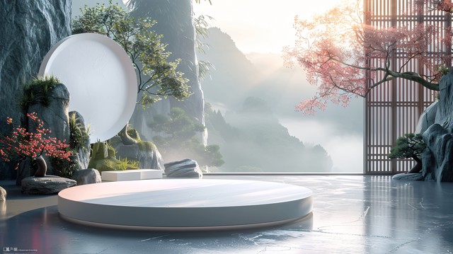 "和谐共融:自然风光前的产品展台,展示与自然和谐共生的现代设计理念"